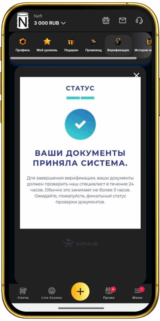 В Neft Casino верификация аккаунта является обязательной процедурой, которую должны пройти гости, завершившие регистрацию. Данная процедура позволяет участникам защитить аккаунт от несанкционированного входа, а также является обязательным требованием при выплате выигрышей. Чтобы верифицировать профиль необходимо: